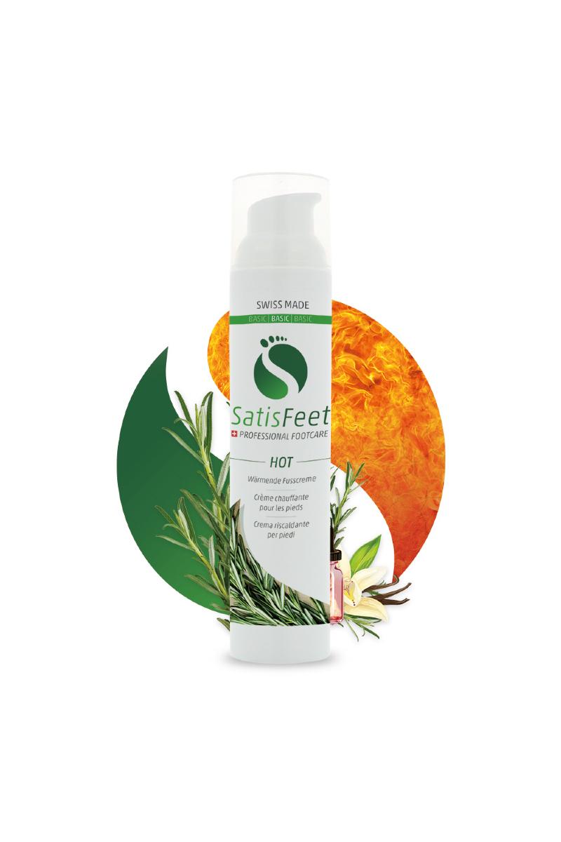 Varmende fotkrem som absorberer lett. SatisFeet Hot får i gang sirkulasjonen ved stimulering av nerve sensorer. Forebygger trette og verkende føtter, takket være en valgt kombinasjon av rosmarin og lavendel olje. Huden blir hydrert uten å føles klissete. Passer ikke for diabetikere grunnet stimulering av nerve sensorer.